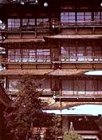 最上階に望楼を設けた能登屋など、こて絵をあしらった外壁せり出し窓など昔ながらの造りが宿を飾る。温泉街奥からは白銀の滝へ向かう渓谷美が楽しめる。 |
